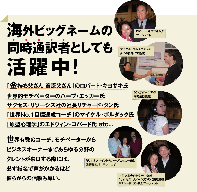 世界有数のコーチ、モチベーターからビジネスオーナーまであらゆる分野のタレントが来日する際には、必ず指名で声がかかるほど彼らからの信頼も厚い。