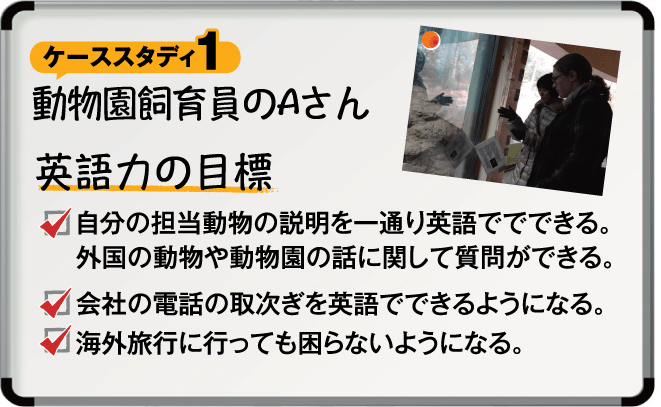 Aさんには、お仕事の中で実際に使うであろうフレーズを聞いて、英訳してお渡ししました(オリジナル資料)。何回かのテストと課題の後、ネイティブとの1対1の電話ロープレを何度かチャレンジ。最後に動物園での実地研修で全目標達成!残りの受講期間を利用して、新たにTOEICスコアの目標決めて進めています。